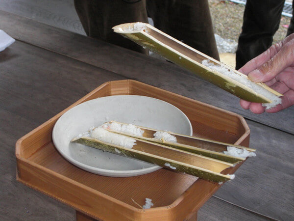 この神社では、早生(わせ)・中生(なかて)・晩生(おくて)の印を付けた竹筒3本とお米を一緒に炊いて、お米の詰まり具合で豊作を占います。