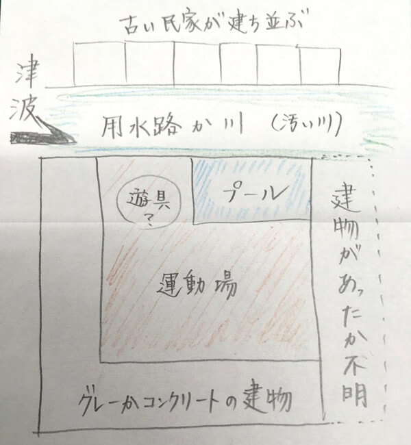 「私たちは鉄筋の市役所の屋上にいました。市役所の前は小学校でした。市役所の後ろは大きめの川でした。川には橋がかかっていて橋の上を津波が逆流していきました。」とありましたが、位置関係が違うかもしれませんが、市役所の側に小学校と川があります。