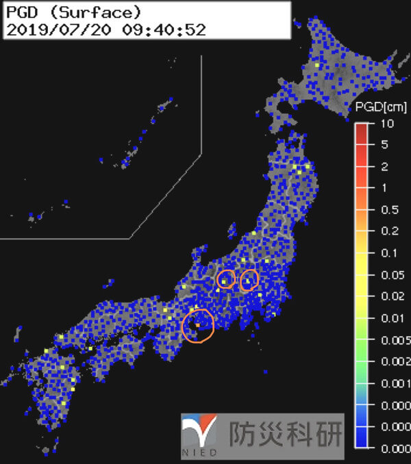 次に強震モニタですが、愛知の伊勢湾沿岸に強いシグナル(オレンジ色)が現れていることが確認できます。