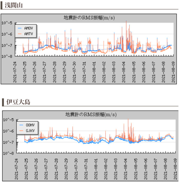 次に火山に設置されている地震計のグラフですが、本州の火山で全国的に振幅が検出されているということは、もしかしたら、噴火の前兆というよりも地震の前兆である可能性もありそうです。