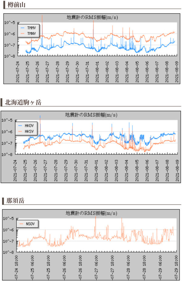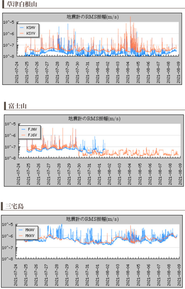 次に火山に設置されている地震計のグラフですが、本州の火山で全国的に振幅が検出されているということは、もしかしたら、噴火の前兆というよりも地震の前兆である可能性もありそうです。